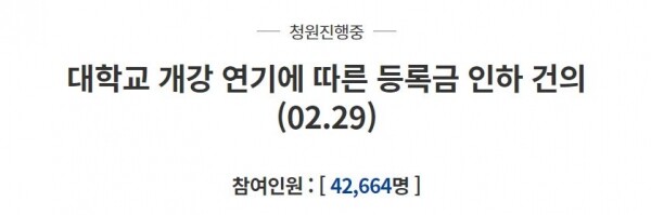 아울러 청원인은 “교육부에서는 개강 연기에 따른 ‘등록금 반환’에 대해 학생들에게 충분히 인지 및 숙지시킬 것을 대학에 권고했다. 하지만 대학에서는 이에 대해 명확한 언급이 없는 상황”이라고 덧붙였다.