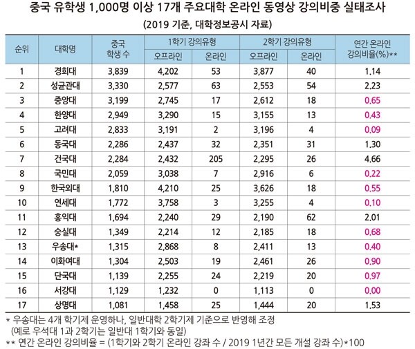 경희대, 성균관대, 중앙대, 한양대, 고려대, 동국대, 건국대, 국민대 등 중국 유학생 2,000명 이상인 대학을 포함해 213개 일반대학(분교 포함)의 2019년 온라인 강의 비중은 0.92%로 1%도 안 되는 것으로 나타났다.
