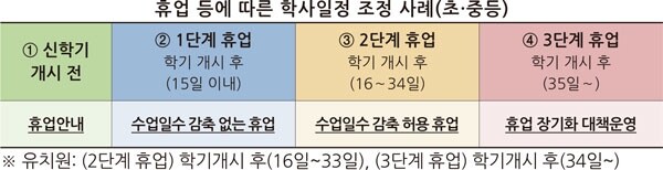 교육부가 지난 2월 24일 시·도 교육청과 각급 학교에 보낸 ‘코로나19 대응을 위한 2020학년도 신학기 학사운영 방안’에 따르면 학교 휴업은 총 1∼3단계로 나뉜다.