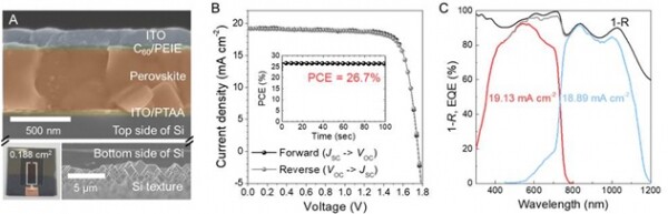 공동 연구팀은 더 나아가 개발한 페로브스카이트 물질을 상용화된 기술인 실리콘 태양전지에 적층해 탠덤 태양전지를 제작하는 데 성공했고, 최고 수준인 26.7%의 광 변환 효율을 달성했다.