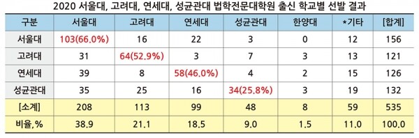 최근 발표된 서울대‧고려대‧연세대‧로스쿨 신입생 결과를 종합한 결과, 서울대 출신이 208명(38.9%)으로 가장 많고, 고려대 113명(21.1%), 연세대 99명(18.5%) 순이었다. 이른바 SKY대학 출신이 420명으로 전체 합격자의 78.5%를 차지한 것. 한양대 로스쿨 신입생까지 포함하면 SKY 출신은 476명으로 89.0%다.