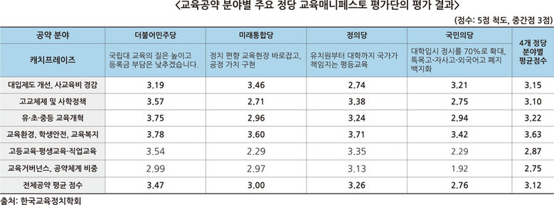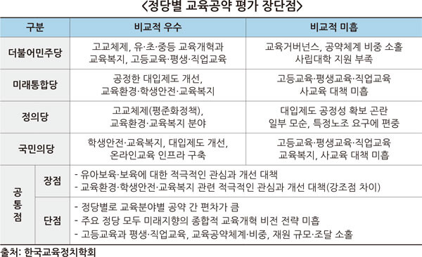 정당별 장단점은 명확했다. 더불어민주당은 고교체제, 유·초·중등 교육개혁과 교육복지, 고등교육·평생·직업교육에서 우수하다는 평가를 받았다. 반면 교육공약의 체계와 비중이 소홀하고, 사립대학 지원이 부족했다.