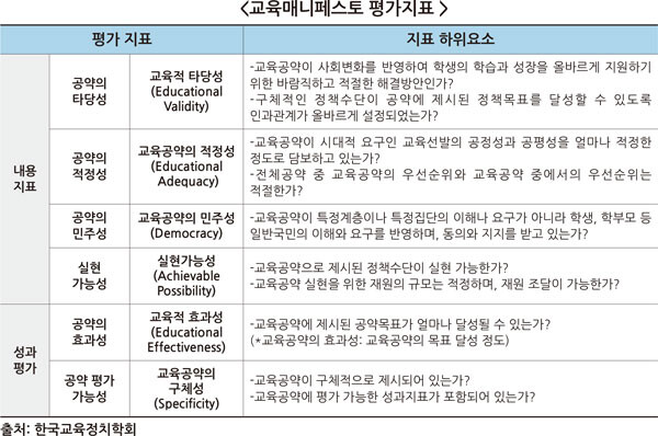 한국교육정치학회가 개발한 '교육매니페스토 평가지표(E-V-A-D-A-E-S)'는 기존 여러 매니패스토지표를 교육 분야에 적합하게 수정·개선한 것으로, 6개 지표와 10개 하위요소로 구성했다.