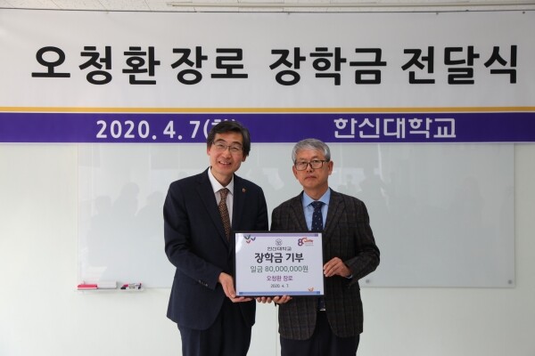 [대학저널 이효정 기자] 한신대학교(총장 연규홍)는 지난 7일 서울캠퍼스에서 ‘오청환 장로 장학금’ 약정식을 가졌다. 한국기독교장로회 전국장로회연합회 장학위원회 총무로 봉사 중인 오청환 장로는 훌륭한 목회자 양성에 써달라며 앞으로 10년에 걸쳐 총 8천만 원의 장학금을 약정했다.