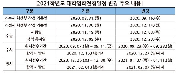 학생부 작성 기준일이 연기되면서 수시와 정시 원서접수기간 및 합격자 발표일도 각각 연기됐다.