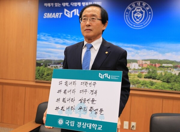 이 총장은 집무실에서 직접 손으로 ‘#힘내라 대한민국 #힘내라 대구·경북 #힘내라 상공인들 #힘내라 우리 학생들’이라는 손글씨를 작성해 사진을 찍고 경상대 공식 블로그(https://blog.naver.com/gnujinju)와 페이스북(https://www.facebook.com/smartGNU)에 올렸다.