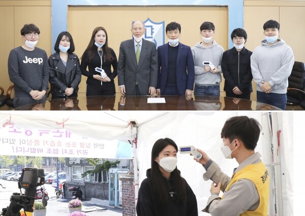 [대학저널 신효송 기자] 경남대학교(총장 박재규) 재학생들이 14일 신종 코로나바이러스 감염증-19(이하 코로나19)의 지역사회 확산 예방에 총력을 기울이고 있는 모교를 위해 자발적으로 제작한 ‘비접촉식 적외선 체온계(코비템)’ 20개를 기부했다.
