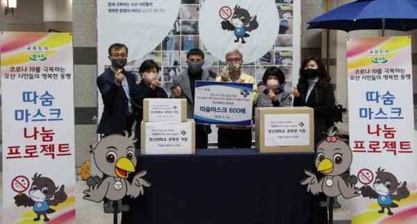 [대학저널 신효송 기자] 오산시와 한신대학교(총장 연규홍)는 14일 오산시청 1층 로비에서 한신대에 재학 중인 외국인 유학생을 위한 ‘따숨 마스크’ 전달식을 갖고 코로나19 사태를 이겨내기 위한 지속적인 관학협력을 약속했다.