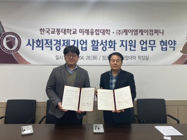 [대학저널 이효정 기자] 한국교통대학교(총장 박준훈)는 ㈜케이엘케이컴퍼니(대표이사 김성욱) 관계자 등 10여 명이 참석한 가운데 ‘사회적경제기업 활성화 지원’을 위한 업무협약을 지난 28일 미래융합대학 학장실에서 체결했다.