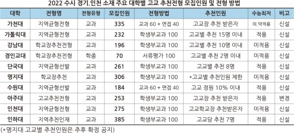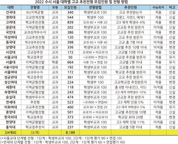 [대학저널 백두산 기자] 현재 고등학교 2학년이 대학에 입학하는 2022학년도 대입 전형에서 수시 학교장 추천전형이 서울 소재 대부분의 대학(24개교: 12개교 신설, 9개교 변경, 3개교 유지)에서 실시된다. 총 모집인원은 8,189명으로 전체 모집인원 7만 1,395명의 11.5%다. 경기‧인천 주요 대학들도 해당 전형을 실시한다.