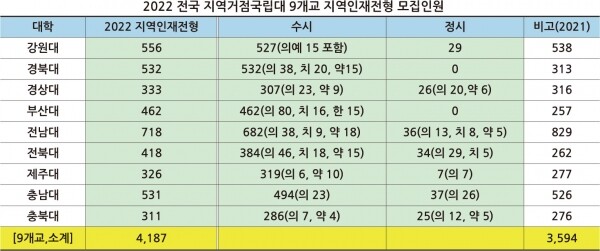 지역인재전형의 경우 2022학년도에 지역거점국립대 9개교에서 4,187명을 모집한다. 2021학년도 지역인재전형 모집인원 3,594명보다 593명(16.5%) 늘어났다.