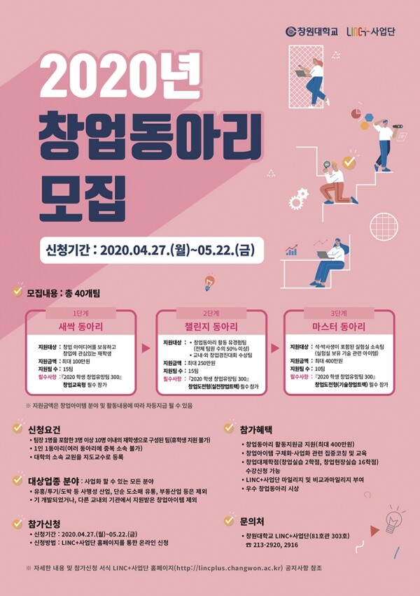 [대학저널 이효정 기자] 창원대학교(총장 이호영)는 창업문화의 확산과 학생들의 창업역량을 강화하기 위해 ‘2020년 창업동아리 발굴·육성 프로그램’을 시행하고, 대학이 지원하는 학생 창업동아리를 모집한다.