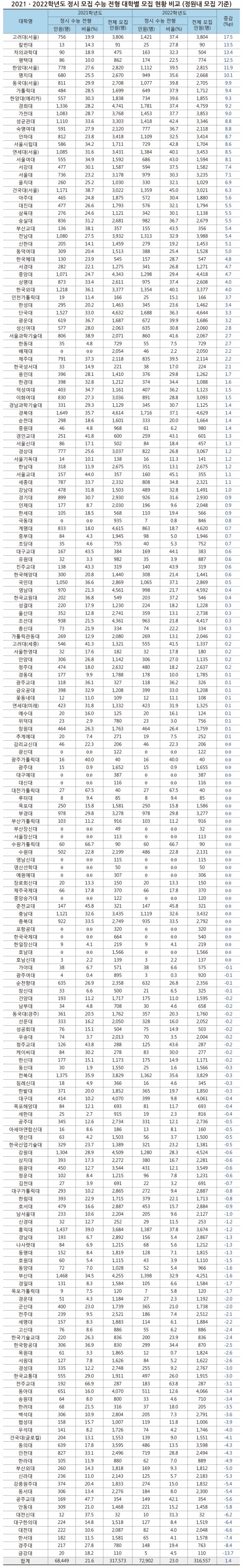 2022학년도 대학입시에서 198개 대학 전체의 수능 전형 선발 비율은 23.0%(72,902명)로 2021학년도에 21.6%(68,449명) 보다 1.4%p 확대 선발한다.