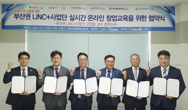 [대학저널 임지연 기자] 한국해양대학교(총장 도덕희) LINC+사업단(단장 경갑수)은 지난 21일 동명대 LINC+사업단 세미나실에서 부산권 LINC+사업단 5개 대학(동서대, 동명대, 동아대, 동의대, 부경대)과 함께 코로나19에 대응하는 실시간 온라인 창업교육 공동운영을 위한 업무협약을 체결했다.