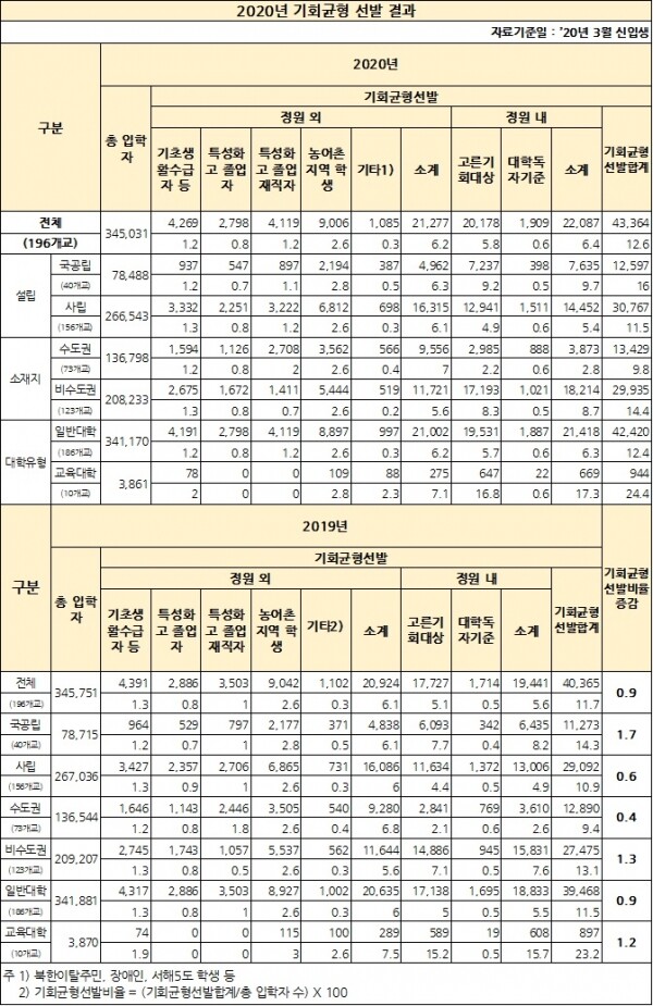 먼저 신입생 선발 결과, 기회균형선발을 통해 선발된 신입생은 4년제 대학 전체 입학생 345,031명 가운데 43,364명(12.6%)으로 지난 2019학년도 대비 약 3,000명 증가했다.