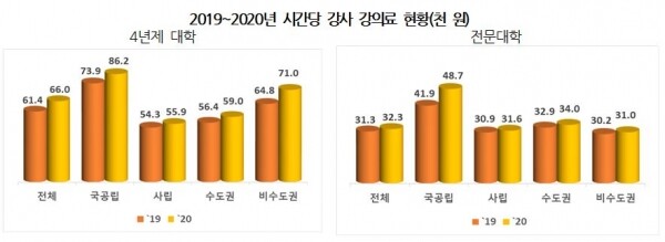 4년제 대학의 2020년 1학기 강사 강의료 평균은 시간당 6만 6천원으로 2019년 6만 1천원에서 7.5% 상승했다. 국공립대학의 강의료 평균은 8만 6천원 가량으로 전년 7만 3천여 원 대비 16.7% 올랐으며, 사립대학의 경우 5만 5천원으로 전년 대비 3% 상승했다.