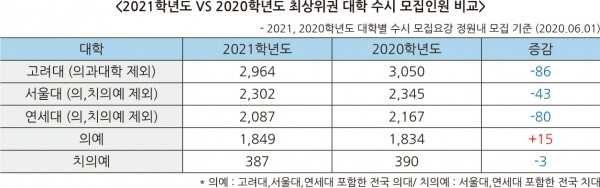 2021학년도 고려대, 서울대, 연세대의 정원내 수시 모집은 전년대비 모두 감소했고, 의예과는 소폭 증가, 치의예과는 거의 차이가 없다. 고려대, 서울대, 연세대가 수시 모집을 줄이고 정시 모집을 늘리면서 고3 학생들이 수시 지원 시 심리적으로 위축될 가능성이 있다. 대학을 유지하기 위해 비선호학과로 하향 지원하는 추세가 재학생 위주로 나타날 수 있다. 또 의·치의예 수시 모집 유지로 자연계열 최상위권 학생들의 의·치의예과 지원이 증가할 수 있다. 이 영향으로 의·치의예 모집의 경쟁은 더 치열해지고, 반면 최상위권 대학의 일부 공학, 자연계열 모집단위의 합격선은 낮아질 여지도 있다.