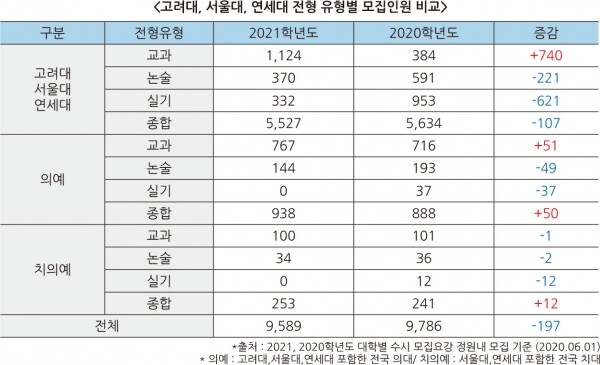 전형 유형별로 봤을 때, 고려대, 서울대, 연세대 등 최상위권 대학에서는 교과전형 모집이 크게 늘고, 논술전형과 실기전형, 즉 특기자 전형 모집이 줄었고, 종합전형도 일부 감소했다. 의예과의 경우도 교과모집이 증가했고, 최상위권 대학과 달리 종합전형도 증가했으며, 논술, 실기 모집 감소했다. 치의예과 모집에서는 종합전형에서 소폭 증가했다.