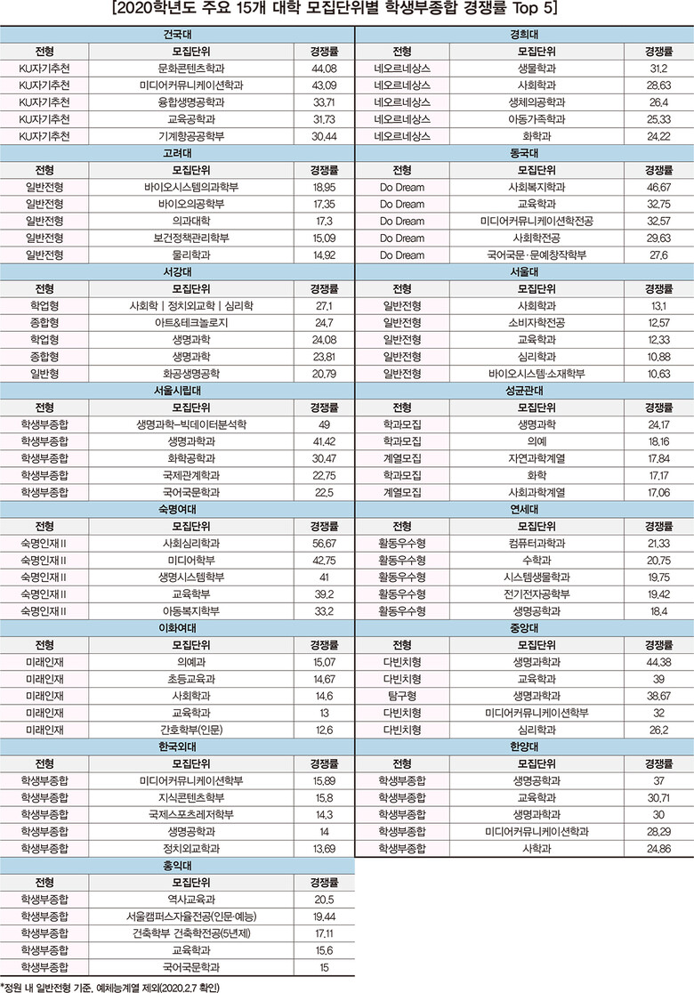 2020학년도 서울 주요 15개 대학 학생부종합 전형 모집단위 중 가장 높은 경쟁률을 보인 곳은 숙명여대 숙명인재 Ⅱ 전형의 사회심리학과로 56.67대 1의 경쟁률을 보였다(정원 내 일반전형, 예체능계열 제외). 서강대 심리학과 등 ‘심리’를 품고 있는 모집단위들의 경쟁률 평균은 18.2대 1로 15개 대학 전체 인문, 자연 모집단위 경쟁률 평균 11.2대 1에 비해 매우 높다. ‘심리학’이라는 학문에 매력을 느끼는 학생들이 많고, 또래 상담 등의 학교내 동아리를 통해 전공적합성을 보여줄 수 있다고 여기는 학생들이 많이 지원하기 때문인 것으로 추측된다.