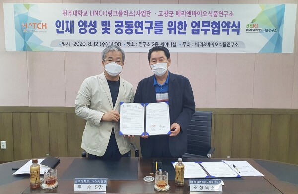 협약식은 전주대 LINC+사업단 주송 단장, (재)베리&바이오식품연구소 조성욱 소장 등 양 기관 관계자 14명이 참석한 가운데 진행됐다.