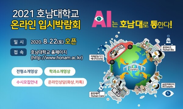 오는 22일부터 열리는 온라인 입시 박람회는 호남대 홈페이지(www.honam.ac.kr)를 허브로 다양한 학교 SNS채널을 통해 유입되며 PC, 테블릿 PC, 모바일 등 다양한 디바이스를 통해 접속이 가능하다.