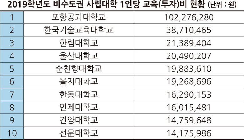 비수도권 사립대학에서는 포항공대 1억 227만 원, 한국기술교육대 3,871만 원, 한림대 2,138만 원, 울산대 2,049만 원, 순천향대 1,988만 원, 을지대 1,926만 원, 한동대 1,629만 원, 인제대 1,601만 원, 건양대 1,475만 원, 선문대 1,417만 원 순으로 나타났다.