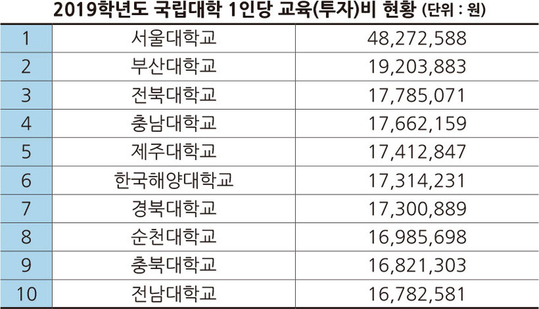 국립대 순위에서는 서울대(4,827만 원), 부산대(1,920만 원), 전북대(1,778만 원), 충남대(1,766만 원), 제주대(1,741만 원), 한국해양대(1,731만 원), 경북대(1,730만 원), 순천대(1,698만 원), 충북대(1,682만 원), 전남대(1,678만 원)가 10위권을 기록했다.