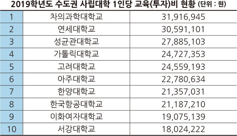 먼저 수도권 사립대학 가운데서는 차의과대가 3,191만 원으로 가장 높은 교육비를 나타냈다. 이어서 연세대 3,059만 원, 성균관대 2,788만 원, 가톨릭대 2,472만 원, 고려대 2,455만 원, 아주대 2,278만 원, 한양대 2,135만 원, 한국항공대 2,118만 원으로 학생 1인당 2천만 원 이상의 교육비를 투자했다.