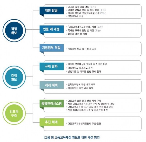 직접 확보 방안은 재원 발굴, 법률 제‧개정, 지방정부 역할 강화로 구분해 16개의 세부방안을 제시했으며, 간접 확보 방안은 대학 재정 규제 완화 및 세제 혜택 방안으로 구분해 5개 세부방안을, 인프라 구축에는 고등교육재정 통합관리시스템 구축, 고등교육재정 심의위원회 구성‧운영을 제안하고 5개 세부방안을 제시했다.