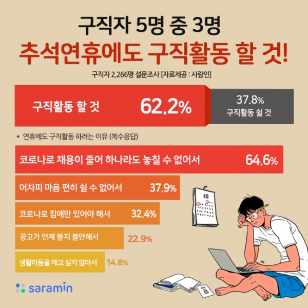 구인구직 매칭플랫폼 사람인(www.saramin.co.kr)이 구직자 2,266명을 대상으로 ‘올 추석 연휴 구직활동 계획’에 대해 조사한 결과, 5명 중 3명(62.2%)이 추석 연휴에도 쉬지 않고 계속 구직활동을 이어 나갈 계획이라고 응답했다(복수응답 허용).