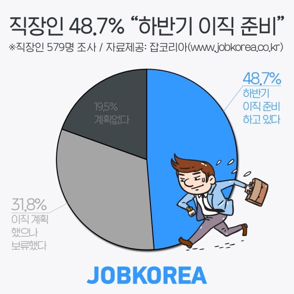 취업 플랫폼 잡코리아(www.jobkorea.co.kr)가 직장인 579명을 대상으로 ‘하반기 이직 계획’에 대해 설문조사를 진행한 결과, 조사에 참여한 직장인 중 48.7%가 ‘하반기 이직을 준비하고 있다’고 답했다.