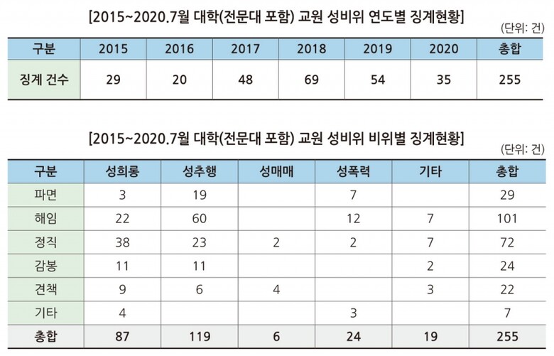 국회교육위 소속 권인숙 의원(더불어민주당)이 교육부로부터 제출받은 ‘대학 교원 성비위 징계현황(2015~2020)’을 분석해 8일 발표한 바에 따르면, 대학(전문대 포함) 교원 성비위 징계 건수는 2015년 29건, 2016년 20건, 2017년 48건, 2018년 69건, 2019년 54건, 2020년 35건으로 나타났다.