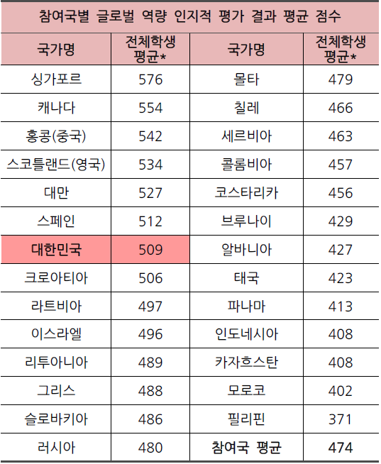교육부가 22일 발표한 ‘OECD 국제 학업성취도 평가(PISA) 2018’에 따르면, 한국 청소년들의 글로벌 역량 지수는 509점으로 전체 평균 474점 대비 35점 높았다.