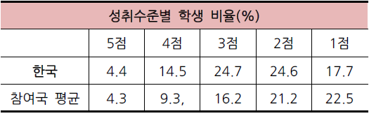 최고 수준 5점과 최저 수준 1점으로 구분되는 평가에서 우리나라 청소년들은 2~3수준에 해당하는 학생이 높은 것으로 파악됐다.