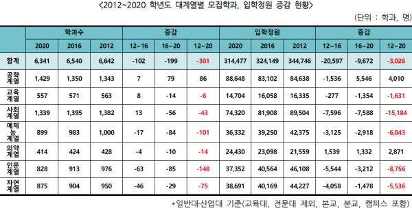 학령인구 감소 등의 영향으로 4년제 대학 전체 입학정원이 2012년 34만 4,746명에서 2020년 31만 4,477명으로 감소한 가운데 공학계열과 의학계열만이 입학정원, 학과수 증가세를 유지했다.