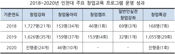 이러한 추세 속에서 대학들은 어떻게 창업 교육을 시행하고 있을까. 대학알리미(www.academyinfo.go.kr) ‘2019년 학생 창업/창업교육 현황’에서 학생 창업자 배출 수 1위를 기록한 인천대의 교육 사례를 살펴봤다.