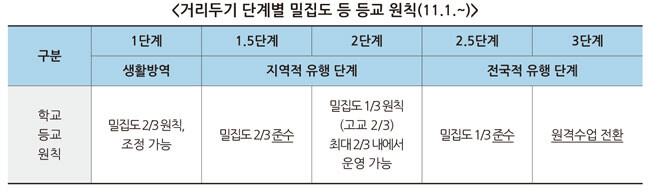 앞으로 수도권‧강원 지역 외 1.5단계로 격상되는 지역 역시 ‘거리두기 단계별 학사운영 기준’에 따라 학교 밀집도 3분의 2 등 등교 원칙에 맞도록 학사운영을 시행해야 한다.