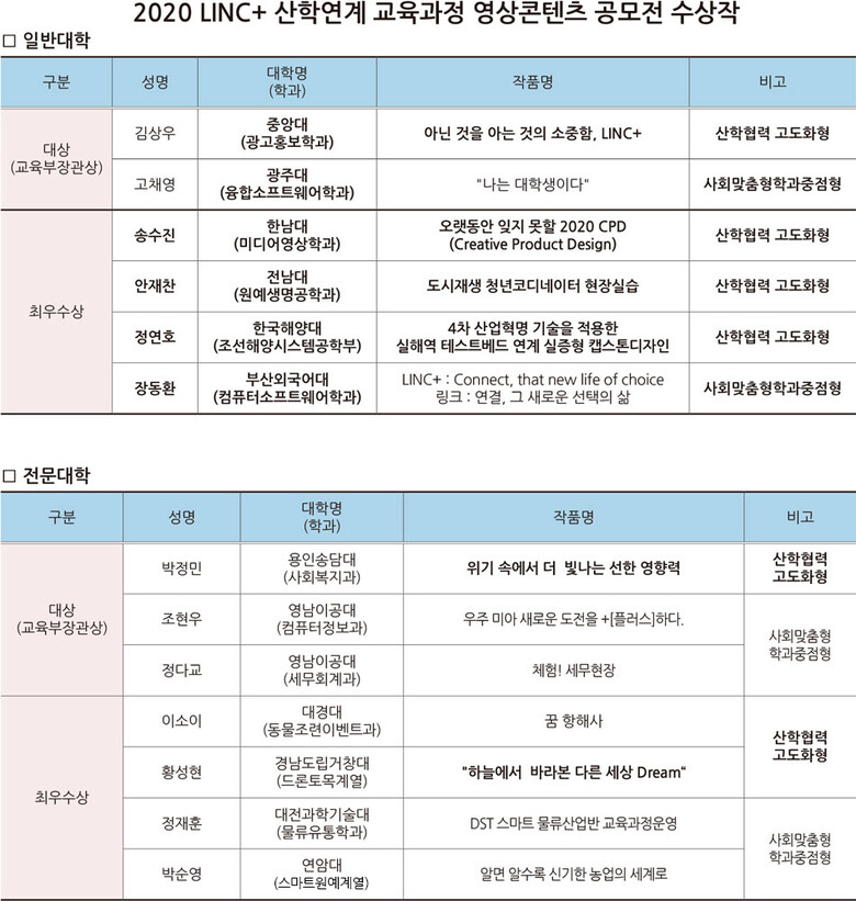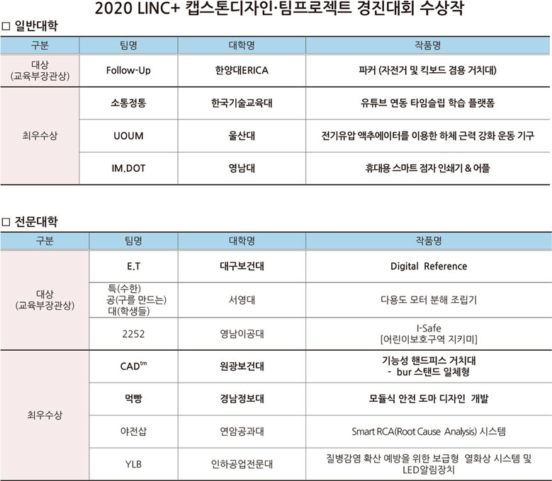 [대학저널 이승환 기자] 교육부와 한국연구재단은 ‘2020년 사회맞춤형 산학협력 선도(전문)대학 육성사업’(LINC+사업) 일환으로 9월 1일부터 11월 17일까지 개최된 ‘산학연계 교육과정 영상콘텐츠 공모전’및 ‘캡스톤디자인·팀프로젝트 경진대회’수상작을 발표했다.