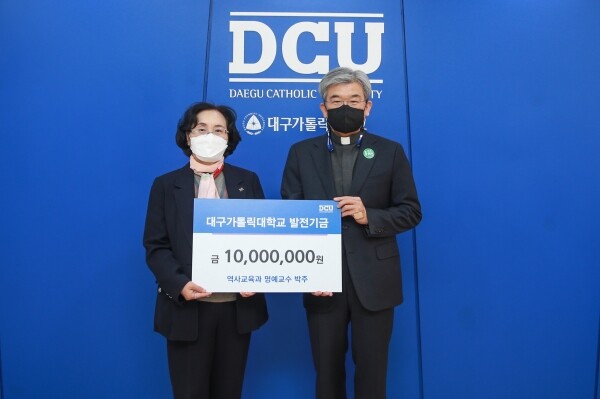 박 교수는 김정우 총장에게 발전기금을 전달하며 “대구가톨릭대에 재직하며 학교와 학생들 덕분에 행복한 시간을 보냈는데 이에 조금이나마 보답하고 싶었다”며 “대학 발전과 후학 양성에 작은 도움이 됐으면 한다”는 뜻을 밝혔다.