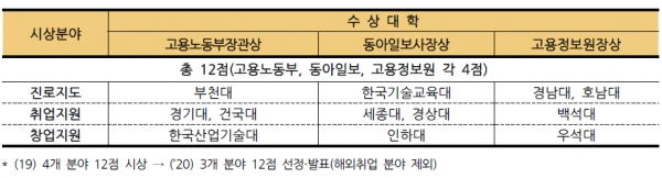 장근섭 청년고용정책관은 “올해는 코로나19로 청년들이 취업 준비에 상당한 어려움을 겪고 있는 상황인 만큼, 대학에서 다양한 진로 및 취·창업지원 프로그램 등을 운영해 청년들의 든든한 버팀목이 되길 기대한다”며 “많은 대학들이 선정된 대학들의 우수사례와 비결을 참고해 청년들에게 맞춤형 서비스를 펼쳐주기를 바란다”고 밝혔다.