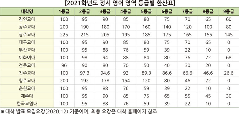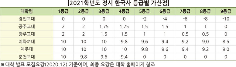 전주교대와 제주대는 특정과목에 가산점이 없으며 한국교원대는 수학 가형 성적에 10% 가산점을 부여하는 등 대학별 차이가 있으므로 가산점 유무에 따른 유불리를 고려해 지원 전략을 세워야 한다.
