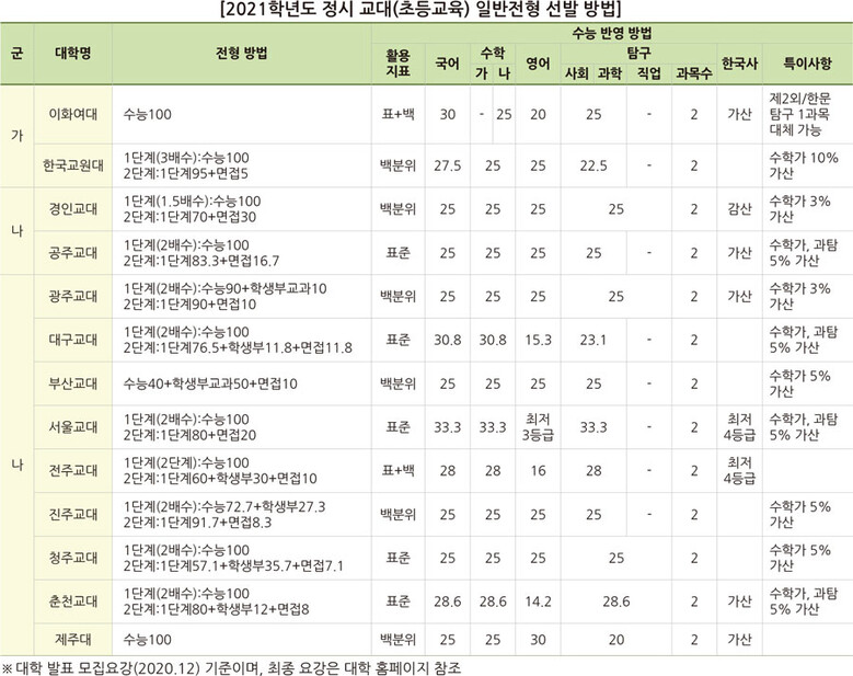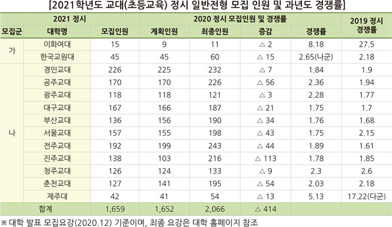 2021학년도 정시모집에서는 전국 10개 교대와 초등교육과가 설치된 이화여대, 제주대, 한국교원대에서 일반전형 기준 1,659명을 선발한다. 지난해와 비교해 전체 선발 인원은 큰 변동이 없으며 부산교대, 춘천교대 등은 정시 선발 인원이 줄었고, 이화여대 초등교육과, 진주교대 등은 정시 선발 인원이 크게 늘었다. 한국교원대는 모집군을 나군에서 가군으로 변경해 이화여대 초등교육과와 함께 가군에서 선발하고 제주대 초등교육과와 10개 교대는 모두 나군에서 선발한다.
