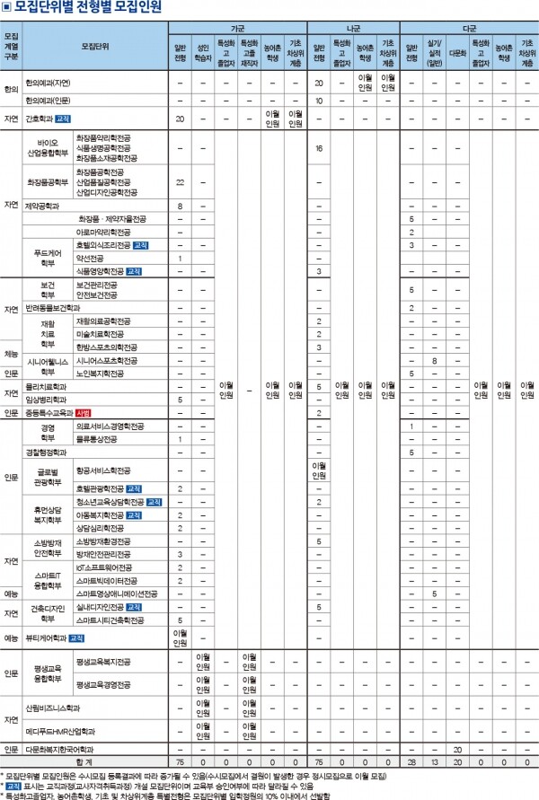 가군 모집단위는 간호학과, 화장품공학부, 제약공학과, 약선전공, 임상병리학과, 물류통상전공, 호텔관광학전공, 아동복지학전공, 상담심리학전공, 방재안전관리전공, IoT소프트웨어전공, 스마트빅데이터전공, 스마트시티건축학전공, 뷰티케어학과, 평생교육복지전공, 평생교육경영전공, 산림비즈니스학과, 메디푸드HMR산업학과다.