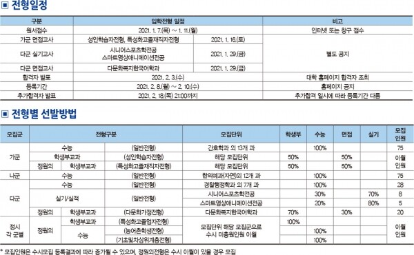 원서접수 기간은 2021년 1월 7일(목)부터 1월 11일(월)까지이며, 합격자는 2021년 2월 3일(수)에 발표할 예정이다. 추가합격자 발표기간은 2021년 2월 18일(목) 21시까지다. 추가합격자는 개별 통보한다.