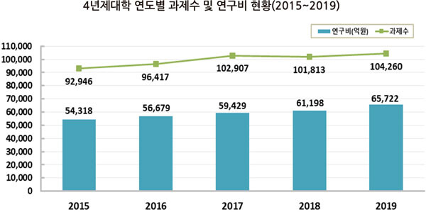 최근 5년간 전임 교원의 연구개발비와 과제수도 증가했다. 연구개발비는 2015년 5조4천억원에서 2019년 6조6천억원으로 1조2천억원 늘었으며, 과제수는 2015년 9만3천건에서 2019년에는 10만4천건으로 증가했다.