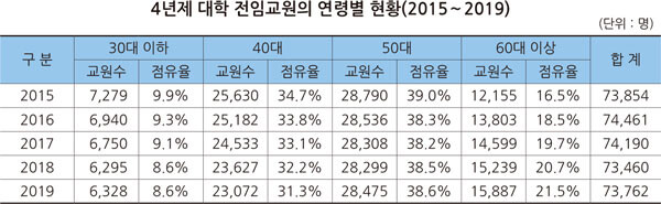 2019년 4년제 대학 전임교원을 연령대별로 보면 2015년 16.5%였던 60대 이상 교원 비율은 2019년 21.5%로 5%p 증가했다. 같은 기간 40대 이상 교원 비율은 3.4%p 줄었다. 30대 이하 교원 비율은 2019년 8.6%였다.