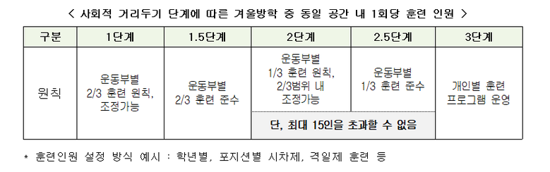 다만 교육부는 2단계와 2.5단계 때 1회당 훈련 인원이 최대 15명을 초과해선 안 된다고 단서를 달았다.
