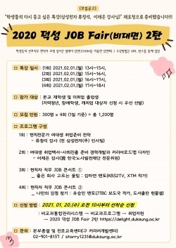 [대학저널 이승환 기자] 덕성여자대학교(총장직무대리 김진우) 학생‧인재개발처 대학일자리본부 본부총괄 및 진로교육센터는 2월 1일 ‘2020 덕성 JOB Fair 2탄’을 개최한다고 28일 밝혔다.