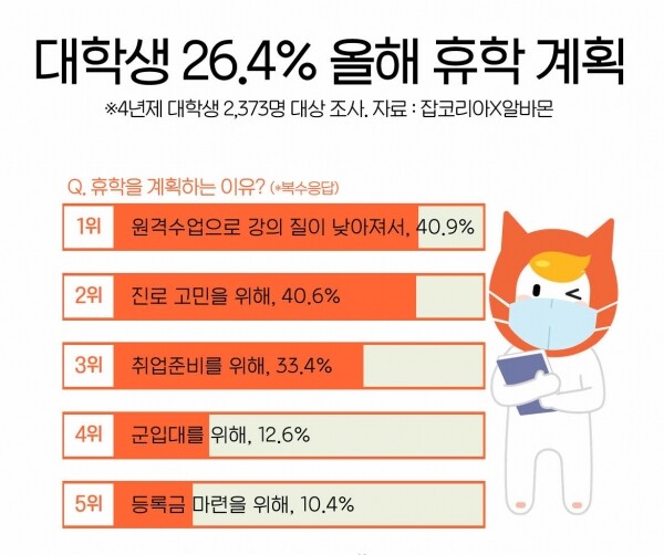 이외에도 ▲군입대를 위해서(12.6%) ▲등록금 마련을 위해서(10.4%) ▲코로나19 감염으로 인한 불안감 때문(8.6%) 등의 이유로 휴학을 계획하고 있다는 응답도 있었다.