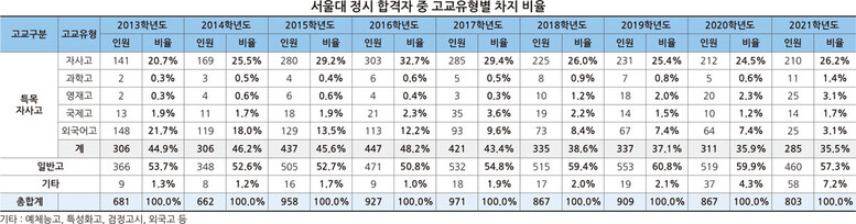 [대학저널 백두산 기자] 2021학년도 대입 서울대 정시 합격자 중 외국어고 출신 학생들이 급감하고 재학생 비율도 5년 연속 감소한 것으로 나타났다.